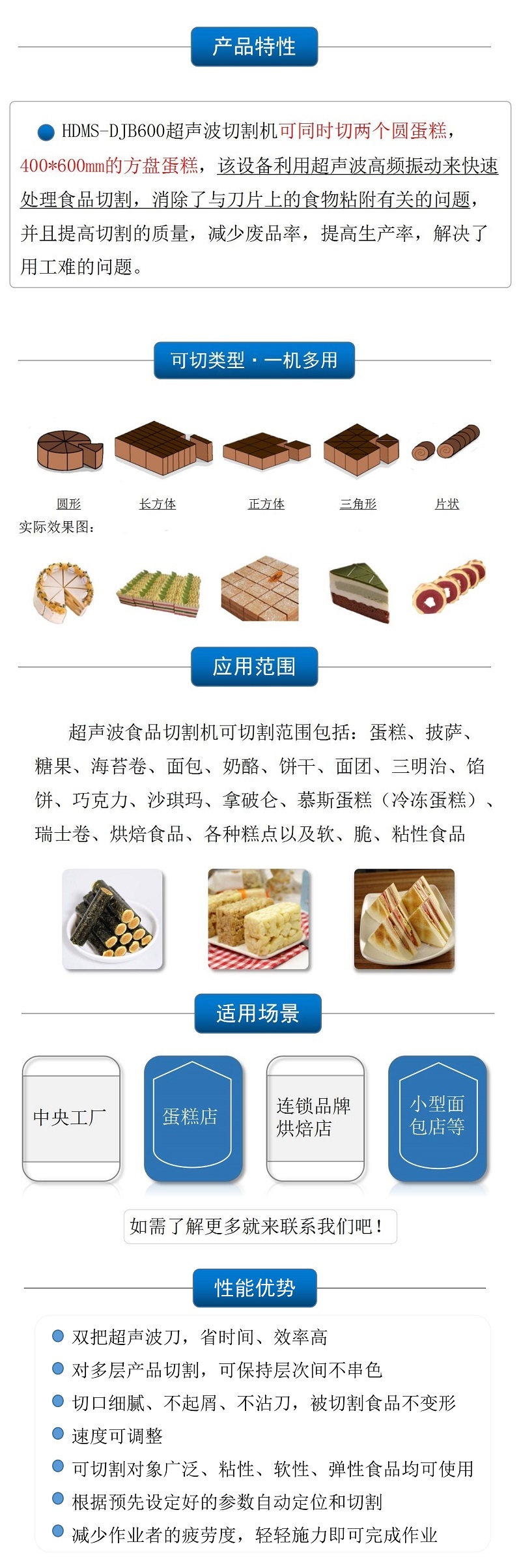 該設備配備雙把超聲波刀片,既可切方蛋糕,也可同時切兩個圓蛋糕,還具有自動上水洗刀、安全光柵的人性化功能,效率高,更方便